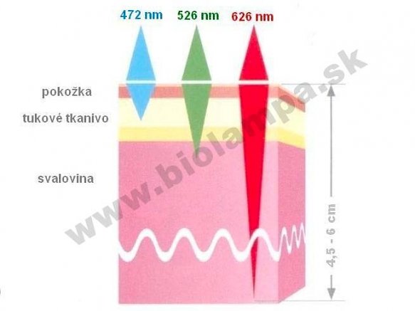 Hĺbka prieniku polarizovaného svetla závisí teda na vlnovej dĺžke a spôsobe jeho generovania. V tomto smere vykazuje najlepšie výsledky červené (626 nm) polarizované svetlo (viď obrázok dole). Prienik svetla je závislý od typu tkaniva, ktoré nasvecujeme. Z experimentu vyplynulo, že tkanivo s vyšším podielom tukových buniek je priepustnejšie ako svalovina, v ktorej je svetlo viac absorbované kvôli vysokému obsahu hemoglobínu a vody. Na základe nameraných výsledkov možno skonštatovať, že svetlo so spektrálnou charakteristikou 626 nm (+/- 18 nm) má pri pravidelných aplikáciách tie najlepšie predpoklady priaznivo ovplyvňovať fyziologické deje nie len na povrchu, ale v tkanivových štruktúrach ľudského organizmu, a to až v hĺbke 4,5 – 6 cm.